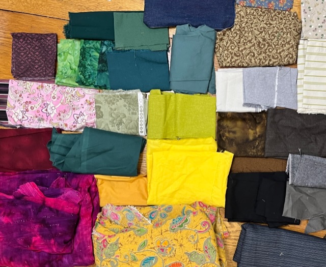 We put the chosen fabrics (along with a year’s supply of Publisher’s Weekly as collage fodder) into a sack, had an hug, and I headed back up the hill. I spent a happy hour combining Katie’s fabrics and mine to come up with the color pallet for my first-ever crazy quilt. (Don’t worry, that odd pink flower fabric is not part of the scheme… she just wandered in.)