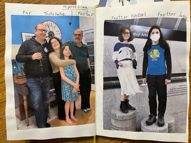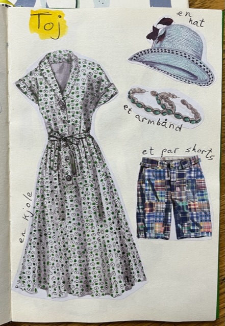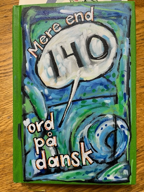 The book is called “More than 140 words in Danish” and I made it using a sketchbook that Auntie Bridgett started but couldn’t use for her art, because the pages were too thin for watercolor. They were perfect, however, for my collage (that is, cut and paste) and colored pencil silliness.