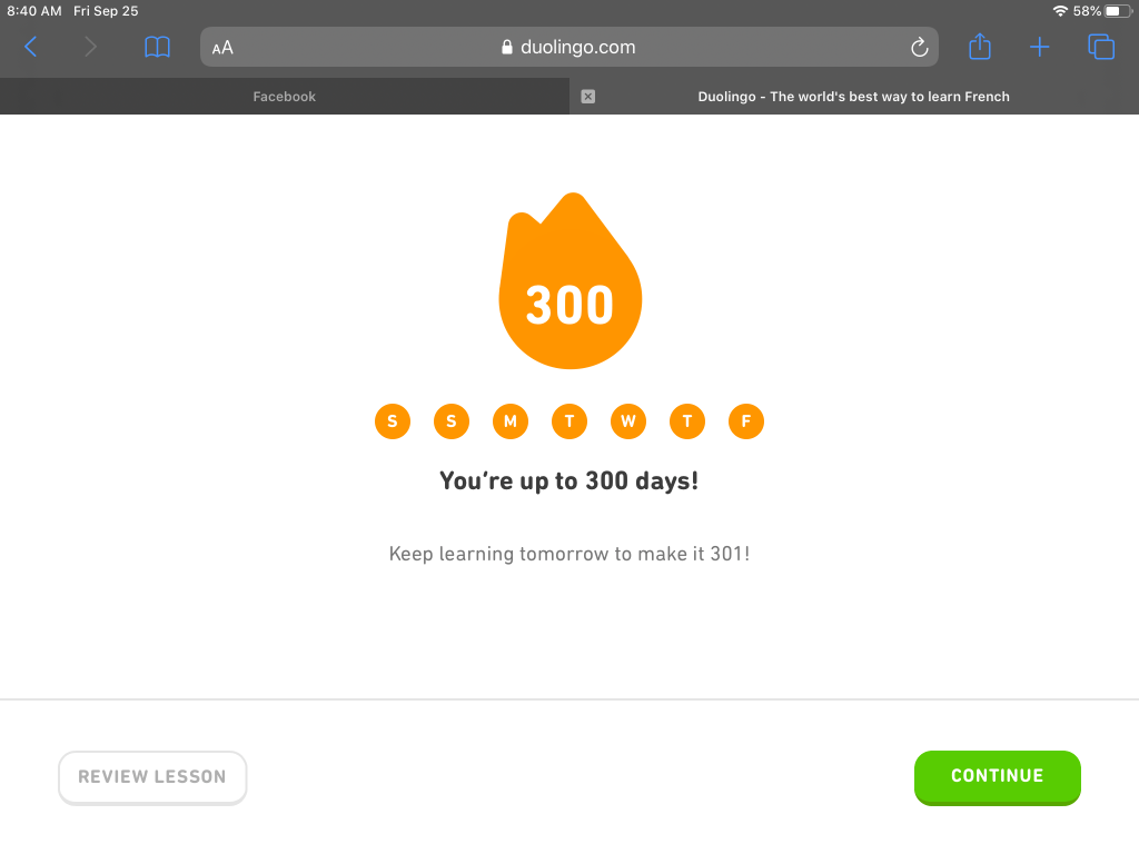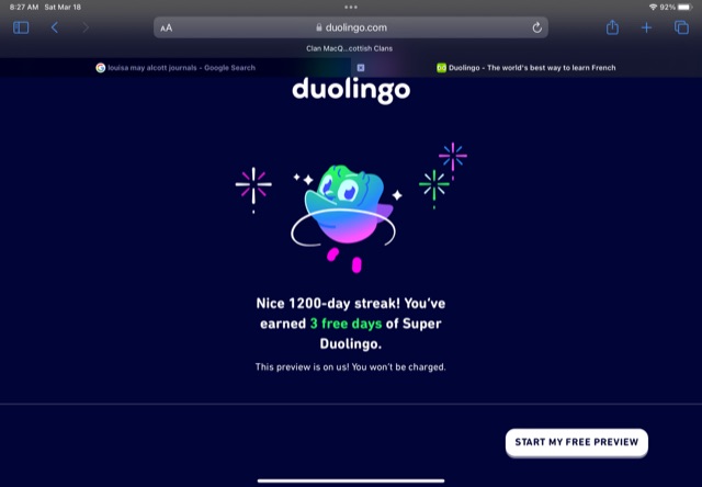 This past week, I passed a new milestone: 1200 straight days of French lessons on Duolingo! I started being diligent about it after I retired and moved to Portland , and Auntie Bridgett makes sure I don’t skip a day.