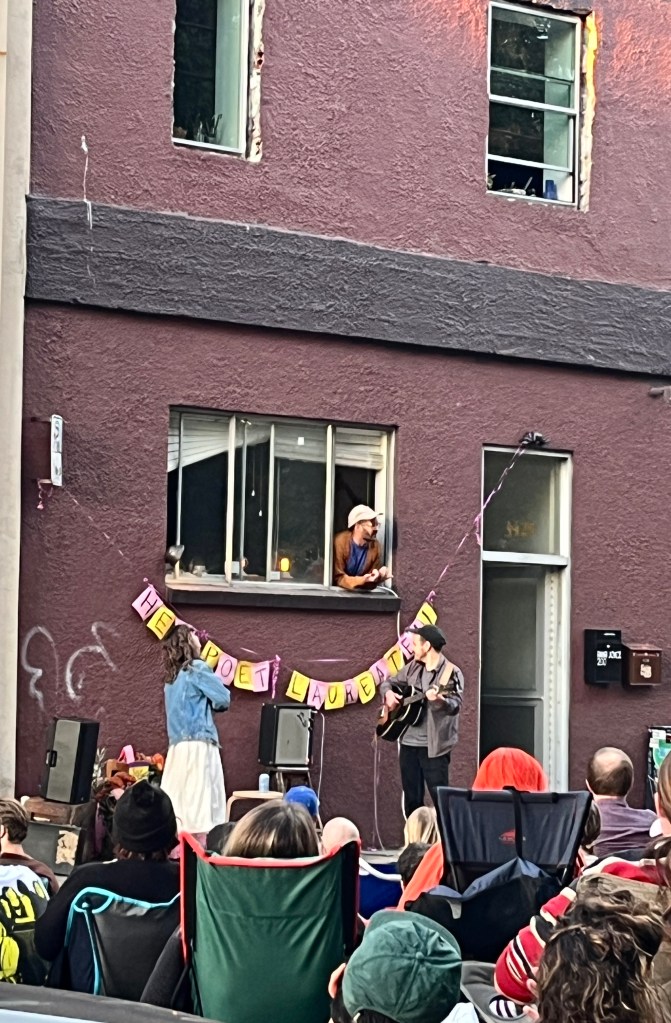 Taking a closer look, we noticed a small amplifier set up by an open window of a re-purposed industrial building. A home-made sign hanging below the window spelled out HEY POET LAUREATE!!