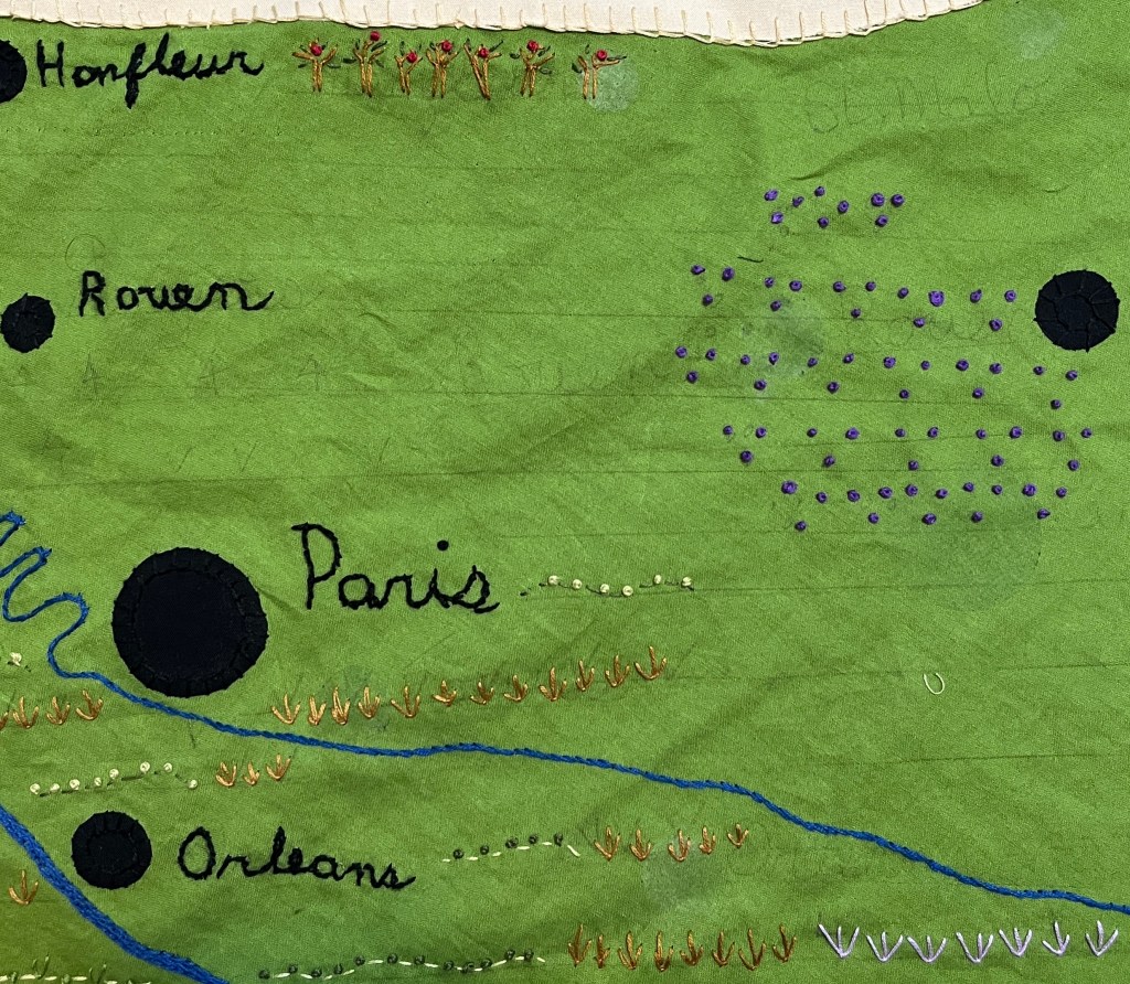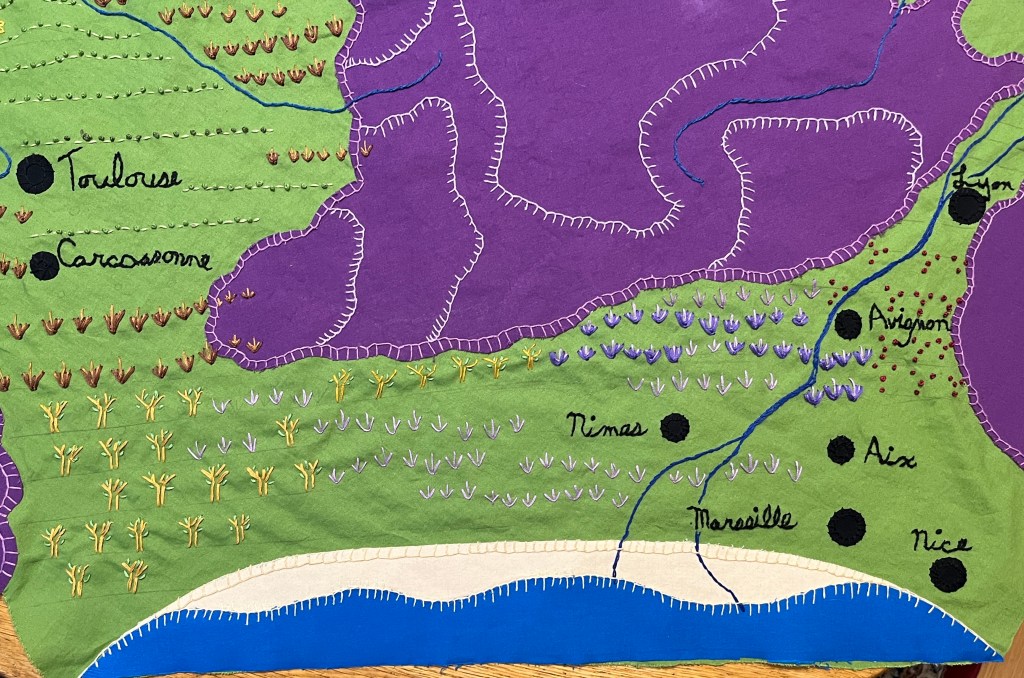 I was feeling pretty good about the shape of my highlands, mountains and shorelines on my French map quilt. Auntie Bridgett admired the lay out, then asked, “Are you going to put anything else on it? Like cities?”