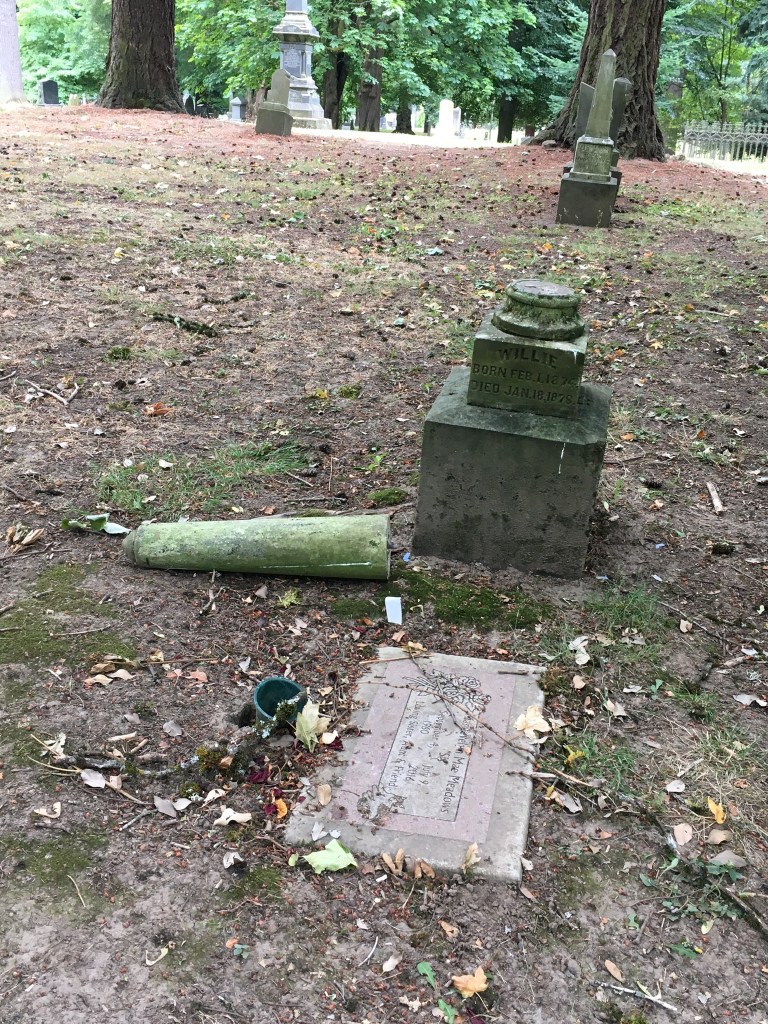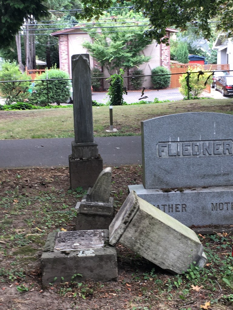 But other people have other, less positive coping mechanisms. One unhappy soul has been wandering around our dear Lone Fir Cemetery, kicking over beautiful, historic headstones.