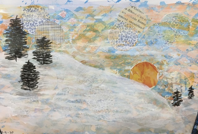 I softened the colors with a bit of white acrylic and added a “hillside”of white tissue paper. The pink circle was in the right place to be a setting sun, but it needed to be more orange. A circle cut from a tea box fixed that.
