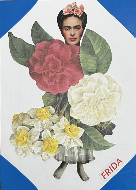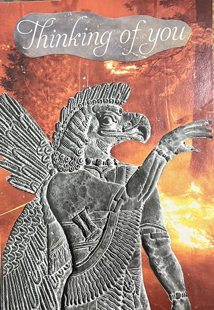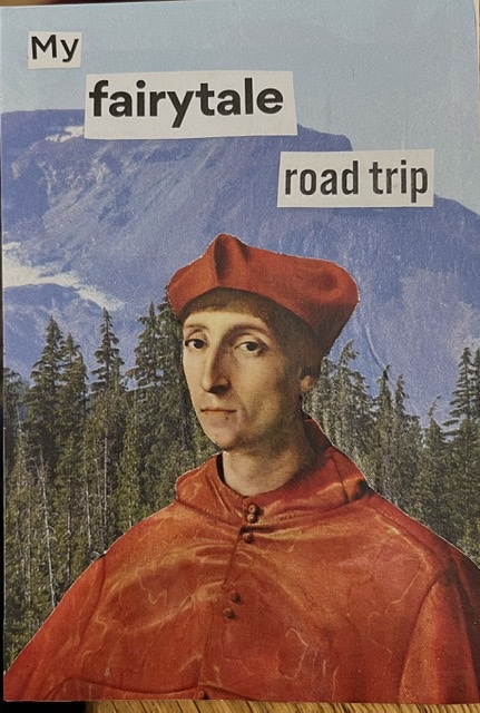 For the images, I use Portal magazine from the Portland Art Museum, Better Homes and Gardens, Via from AAA, and old magazines, postcards and greeting cards I pick up at garage sales and give away boxes. There are also bits from Ruthie Inman and daubs of acrylic paint.