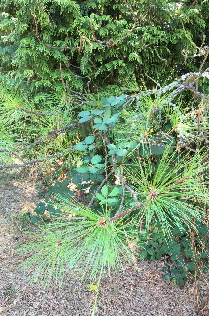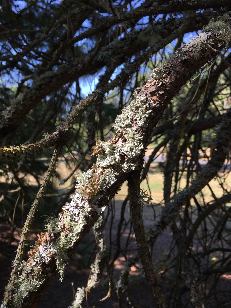 It was hot and dry, but the Pacific Northwest is where I developed my love of moss and lichen, and I was not disappointed. I wandered into some usually- shady spots and found several kinds of lichen flourishing on pine branches. The scaly bits will wait patiently until the rains return.