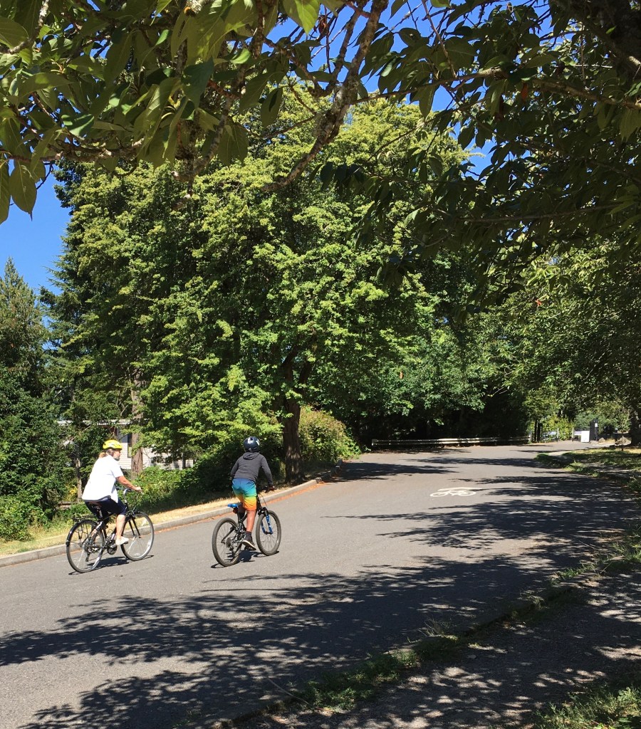 We enjoyed watching the people come and go. The cinder cone that is Mt. Tabor is a favorite for hikers and bikers looking for an in-town challenge. They are resolute going up and joyous coming down.