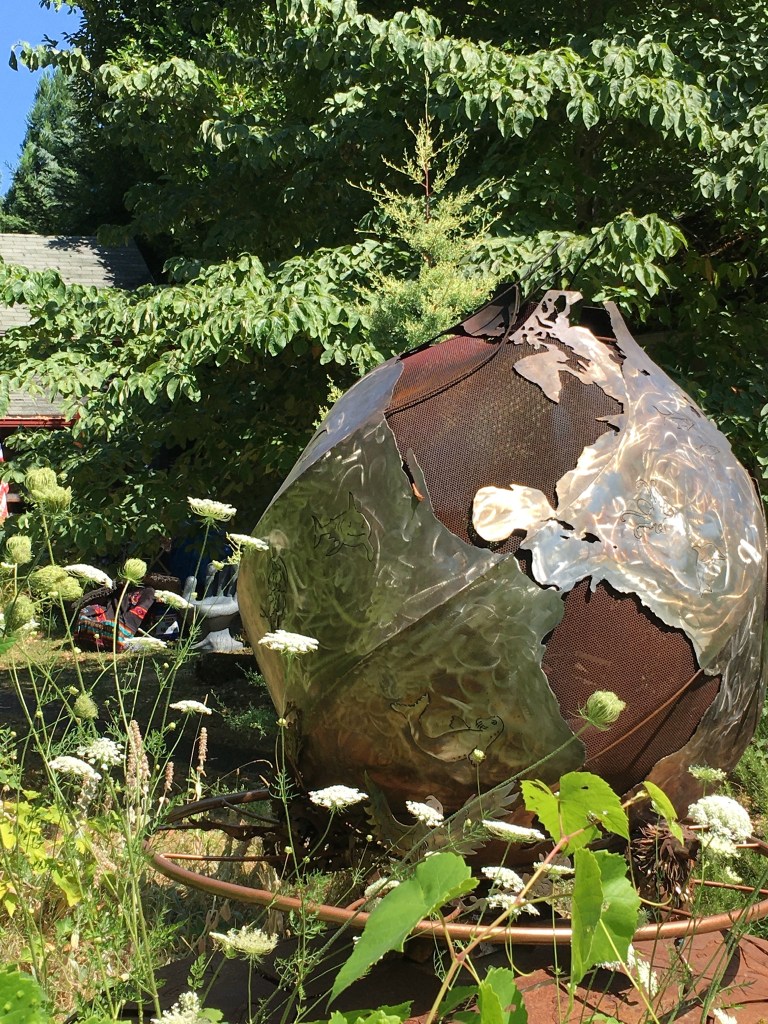 Heading home we found new garden delights. Someone has created this hand-hammered, pomegranate shaped metal fire pit and placed it among blackberries and roses. I imagine it is wonderful on chilly September evenings, glowing in the greenery.