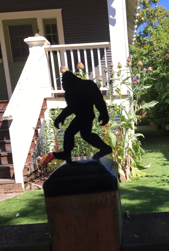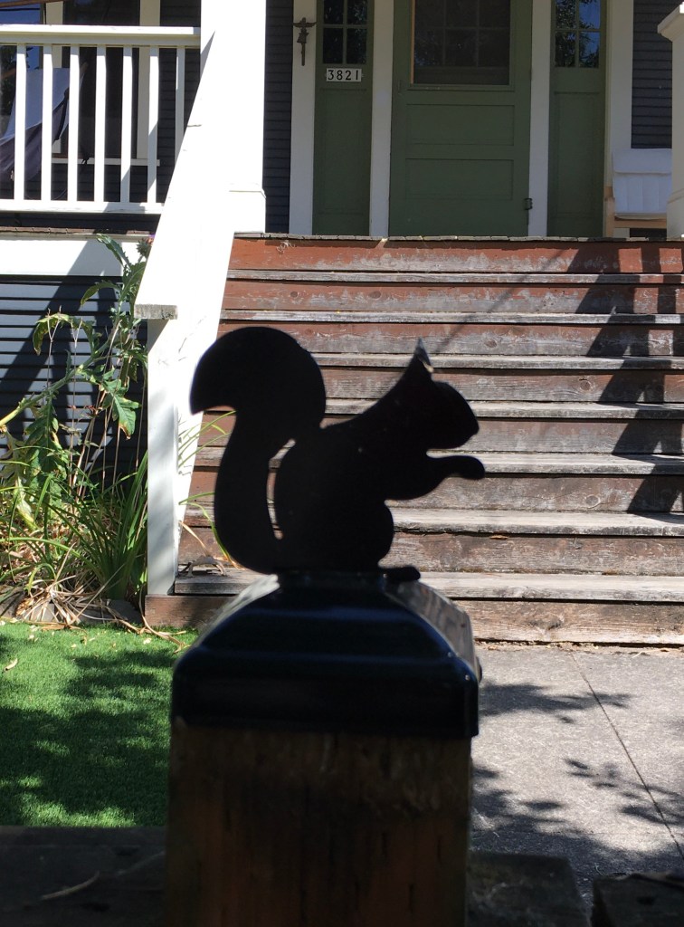 I love walking through new neighborhoods! I always discover beautiful and unusual houses, gardens, and …. well, things. These sheet copper fence-toppers, shaped like silhouettes of a squirrel, a dog, and Sasquatch, tickled me.