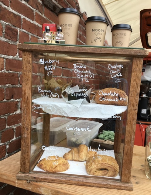 Then, worn out and needing sustenance before grocery shopping, we hunted for a new place Auntie Bridgett had heard about, Moore Coffee…. “It’s in a little alley,” she said. And she was right. And such a pleasant alley!