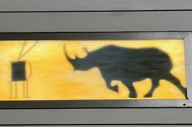 And finally, after climbing on Jim Gion’s lion statues and riding the Merry Go Round, we spotted this odd rhinoceros in the train station. He looks like he has had enough of television, too.