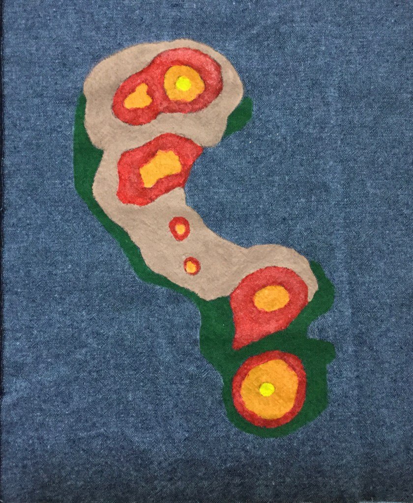 The zipper came from a pillow that has been upcycled into a few other items already. The fabric was purchased years ago for a map quilt that didn’t need it. And the acrylics ( and the textile medium to make them work on fabric) were sitting in a box.