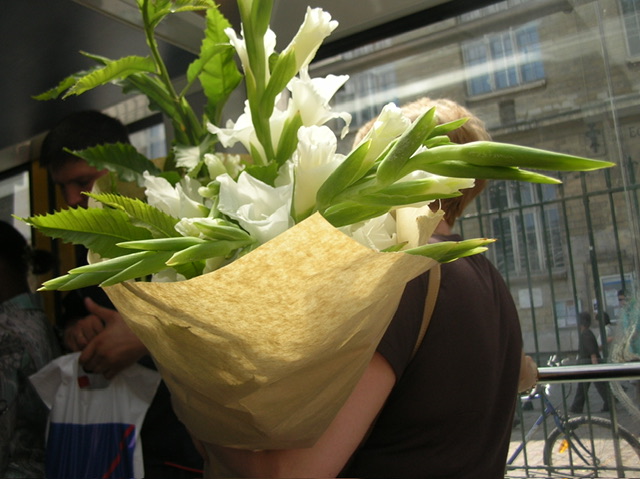 We saw this giant bunch of lilies get on the funicular train going up the bluff of Montmartre in Paris. The lady carrying them walked with assurance that she and her flowers were making the world more beautiful.