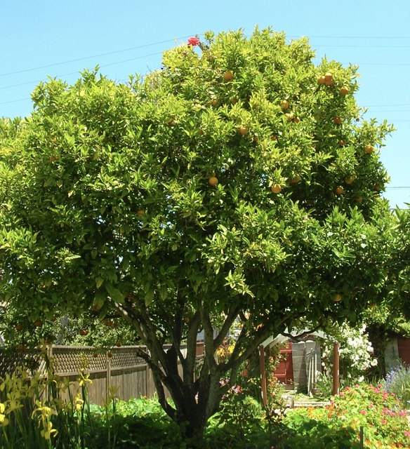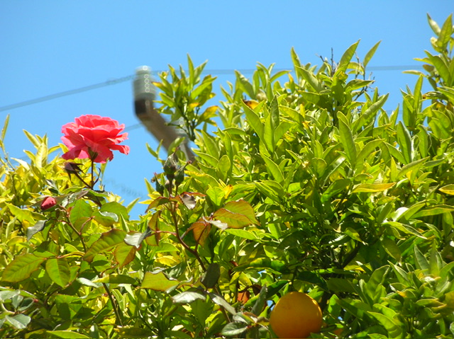 If you look closely, you can see that this is a rose in Lompoc, California. It grew, and just kept growing, in Momma’s garden. It grew up from under her orange tree, through the orange tree, and right out the top! She didn’t notice it until one of her visitors on the Garden Tour pointed it out. “Well, how about that?” she said.