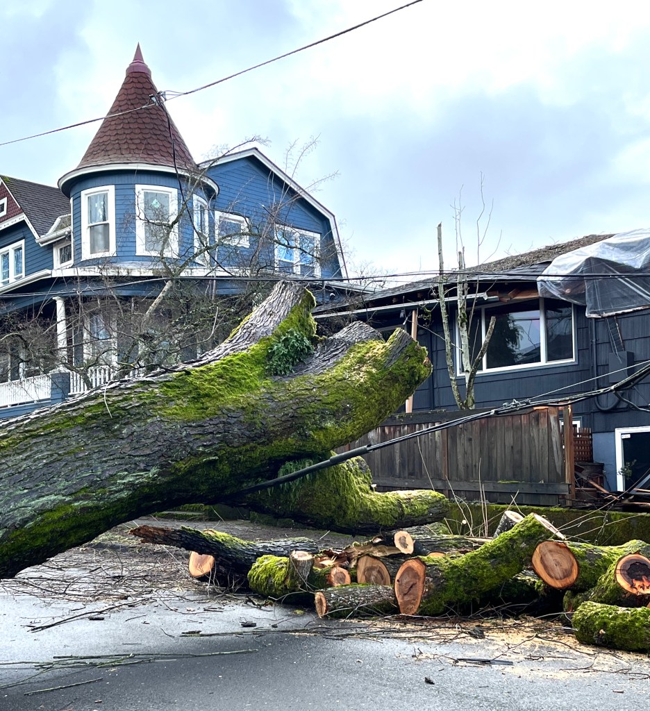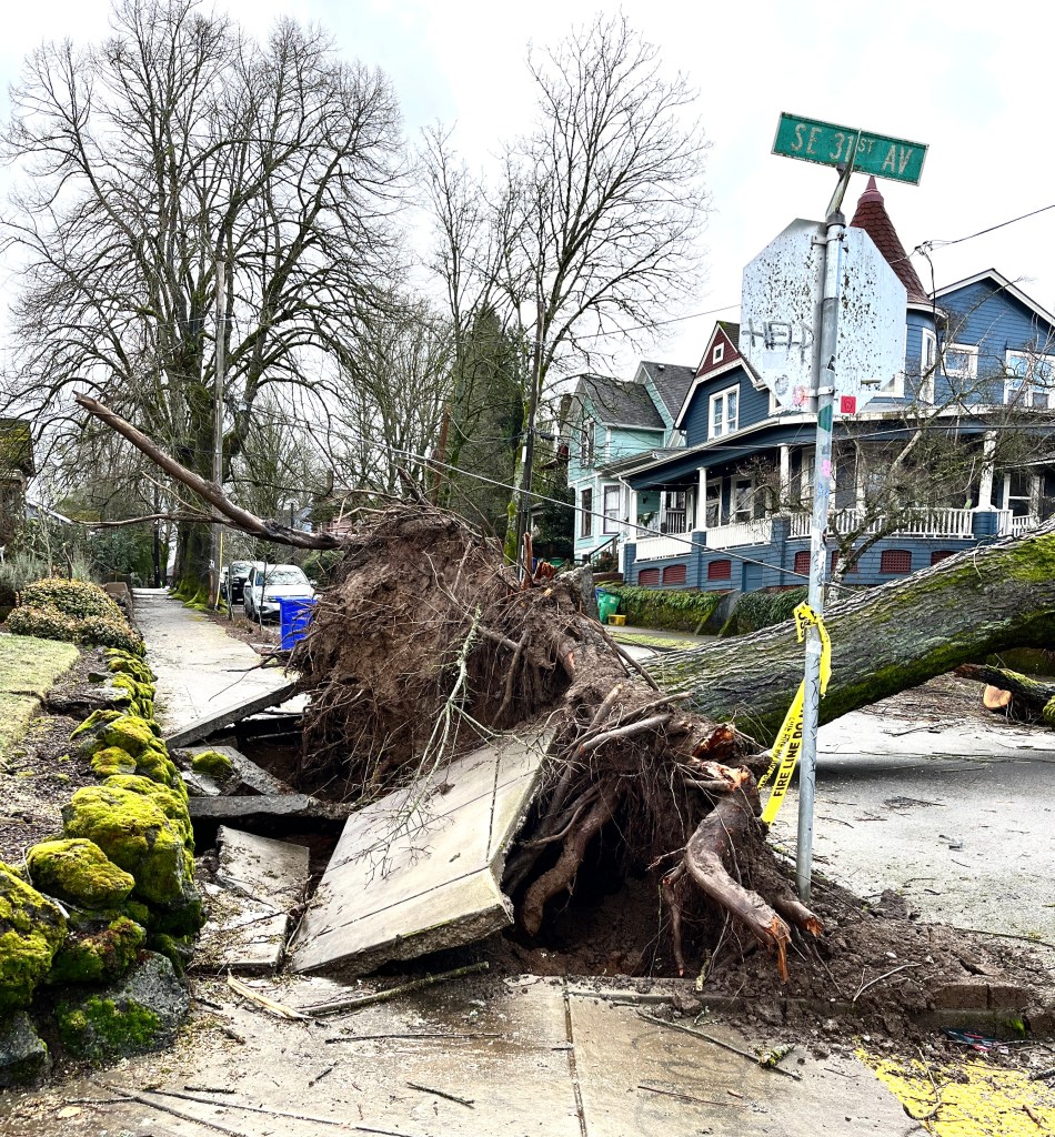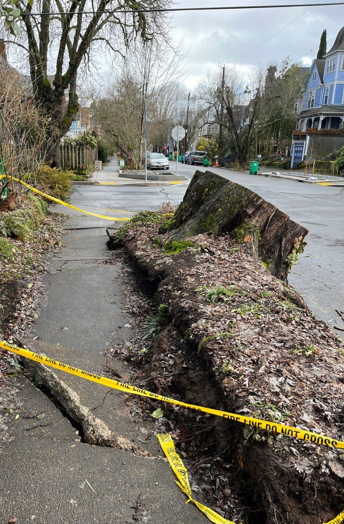 This wonderful giant fell all at once, probably when it was coated with ice and blustered by winds. It fell across the street, taking down part of a roof and power lines and ripping up a chunk of sidewalk.