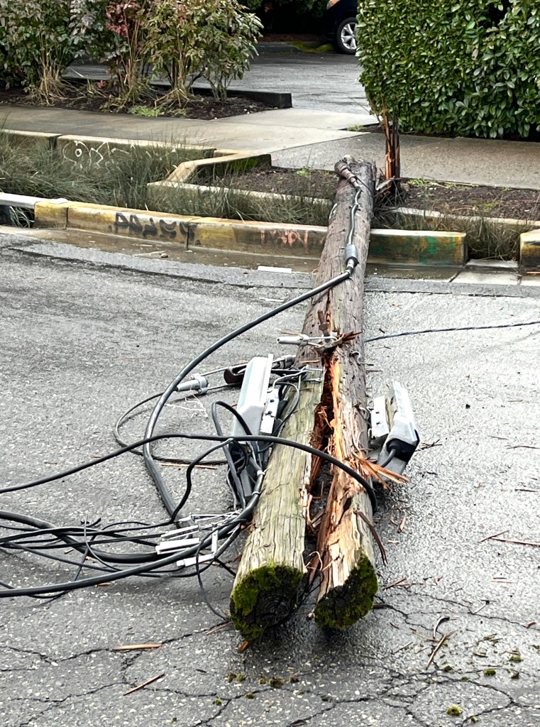 This tree apparently gave a great lean, but stopped before hitting anything. The urban arborists were called, and a quick chain saw saved several houses and power lines.