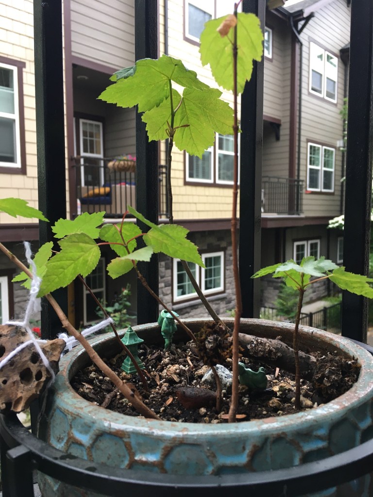 Using a soft yarn to be gentle on their fragile trunks, I have given most of them them a lean, all in one direction, to look like they have all been subject to the same winds. I have tried three different techniques to hold them at about a 45 degree angle: yarn tied to a rock; yarn tied to the pot’s support; and a stick, wedged against the side of the pot. It’s like a science experiment that will play out over many years.