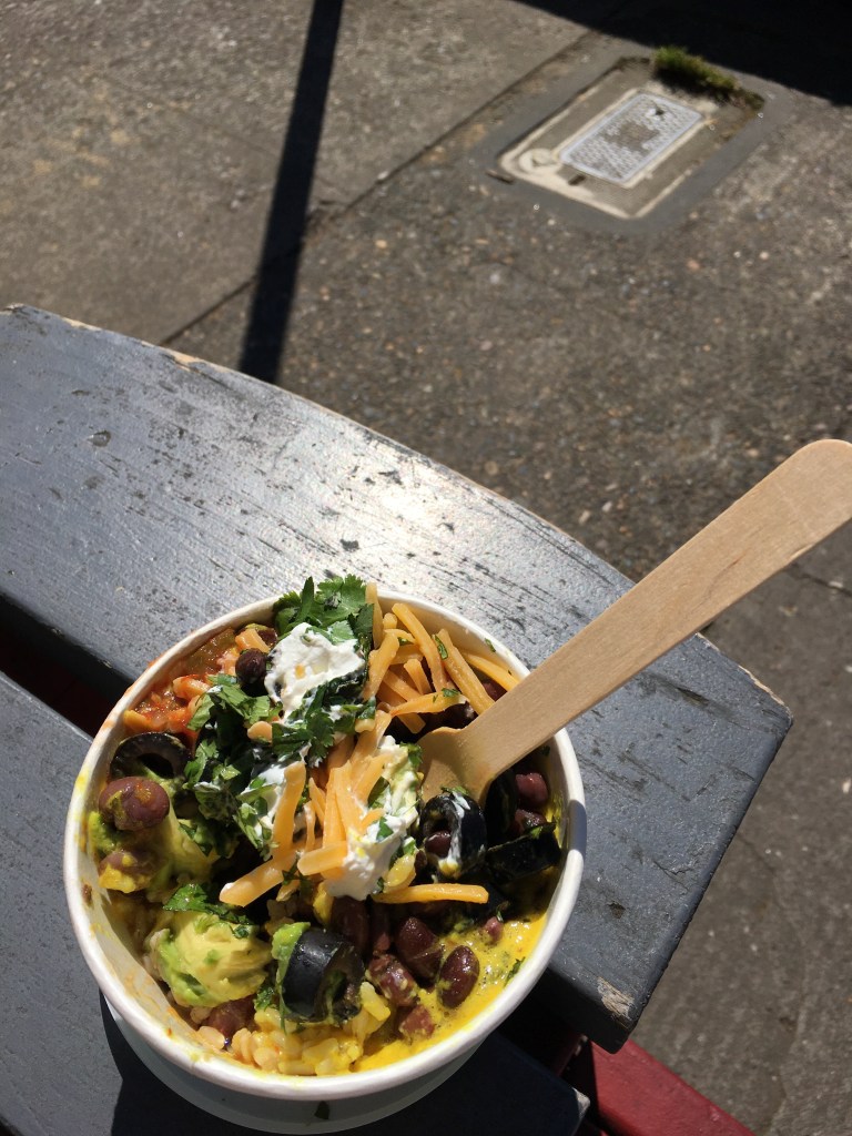 Down on Hawthorne Street, I stopped at one of the few places still serving lunch, The Whole Bowl. Its tiny dining room was closed, but they were still serving wonderful spicy bowls for a good price. I was happy to eat, and they were happy for the business!