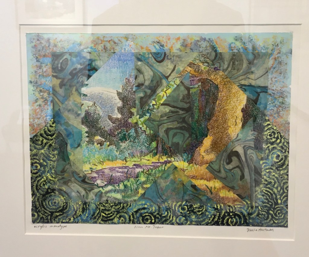 Jessica Hartman , who displayed these intriguing multi-layered prints, been an artist for many years. She did print making for years, then took a break, and found that when she returned to it her work was much different. This makes sense to me. Art comes from who you are at a given moment, and we change, minute to minute. So of course your work would change.