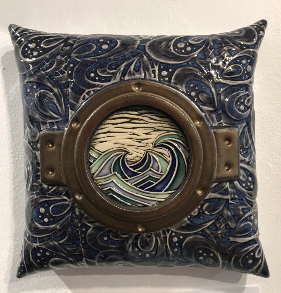 Kristy Lombard is a ceramicist who is also a print artist. She creates the textures on her “wall pillows” by pressing slabs of clay into linoleum sheets she has carved with intricate patterns. Then she adds the delightful details, like ship’s portholes, and shapes the clay into “pillows”. I love the practicality of a three dimensional artwork you can hang on the wall!