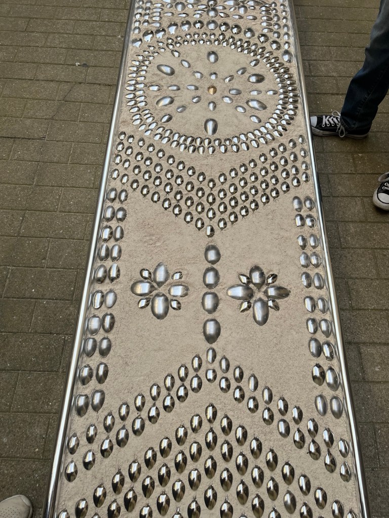 Some of the pieces, like the cherry pie made of bouncy balls, are meant to be interacted with, and were, as we watched. Others, like the hundreds of antique spoons laid into sand, are most definitely “hands off”.