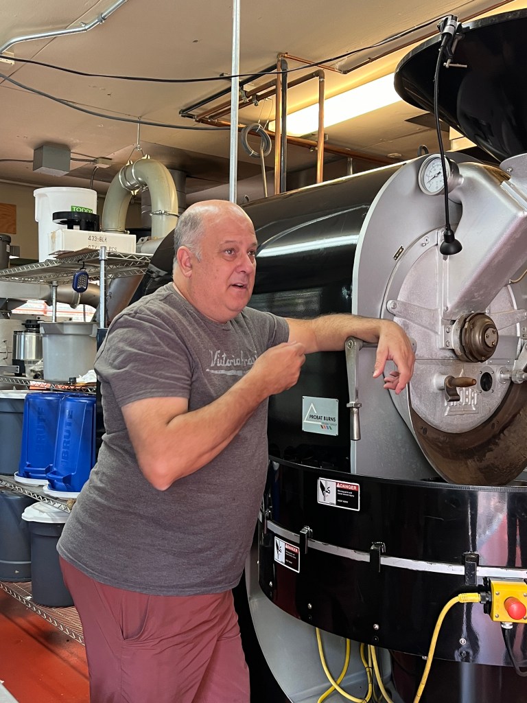 Then, after taking pictures of one of Coraline’s Curious Cats in her lovely urban environment, we caught the #20, connected to the #6, and headed up to the McMenamin’s Coffee Roastery. Considering how many McMenamin’s venues there are, I was amazed at how small the facility was! This one room, one giant roaster, and one guy named Chris.