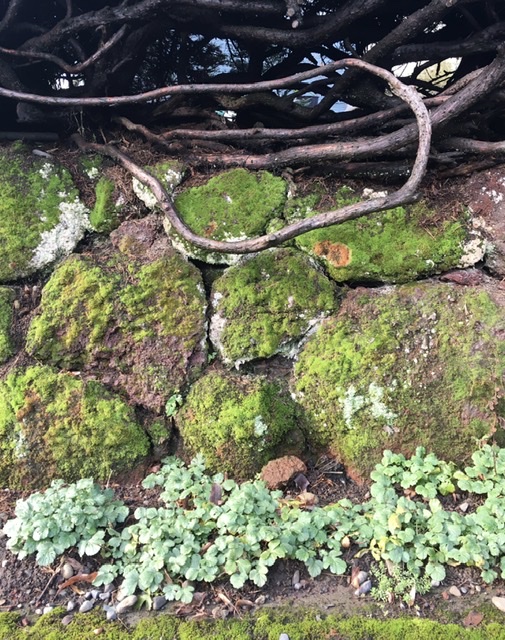 But in a rain-rich environment, corners get soft and sidewalks get green. Tombstones and birdbath become gardens. Walls become magical.