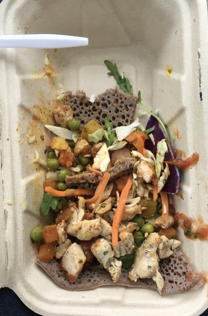A delicious “Ethiopian taco” (actually injera, a flatbread, served with a spicy chicken curry) from “Spice of Africa” was our lunch. We ate it under the shelter of an out of service bus stop during the heaviest of the rain.