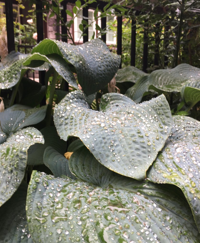 Drops sat like jewels on our hostas and dangled from the birch leaves.