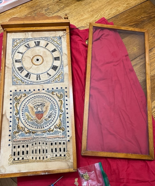 There was still lots to do. The delicate fabric needed to be strengthened and stabilized. Looking online, I found Hemline Iron-On Invisible Mending and ordered some. Then “craft cowardice” set in, the fear that I would mess it up, and the clock sat waiting for me to get up my nerve.