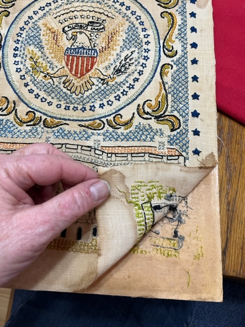 I decided to take a chance on repairing it. I peeled the fragile fabric off its Masonite backing and gave it a wash. The stains faded, but didn’t go away.