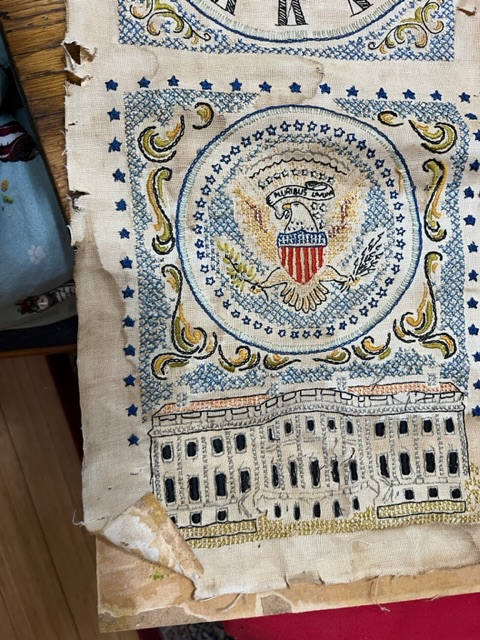 Last November, I found Grandpa Nelson’s old clock in the garage. His mom, Mona, had embroidered it for him and his sisters when they were little, about 60 years ago. Over many years and many moves, it had gotten stained and damaged.