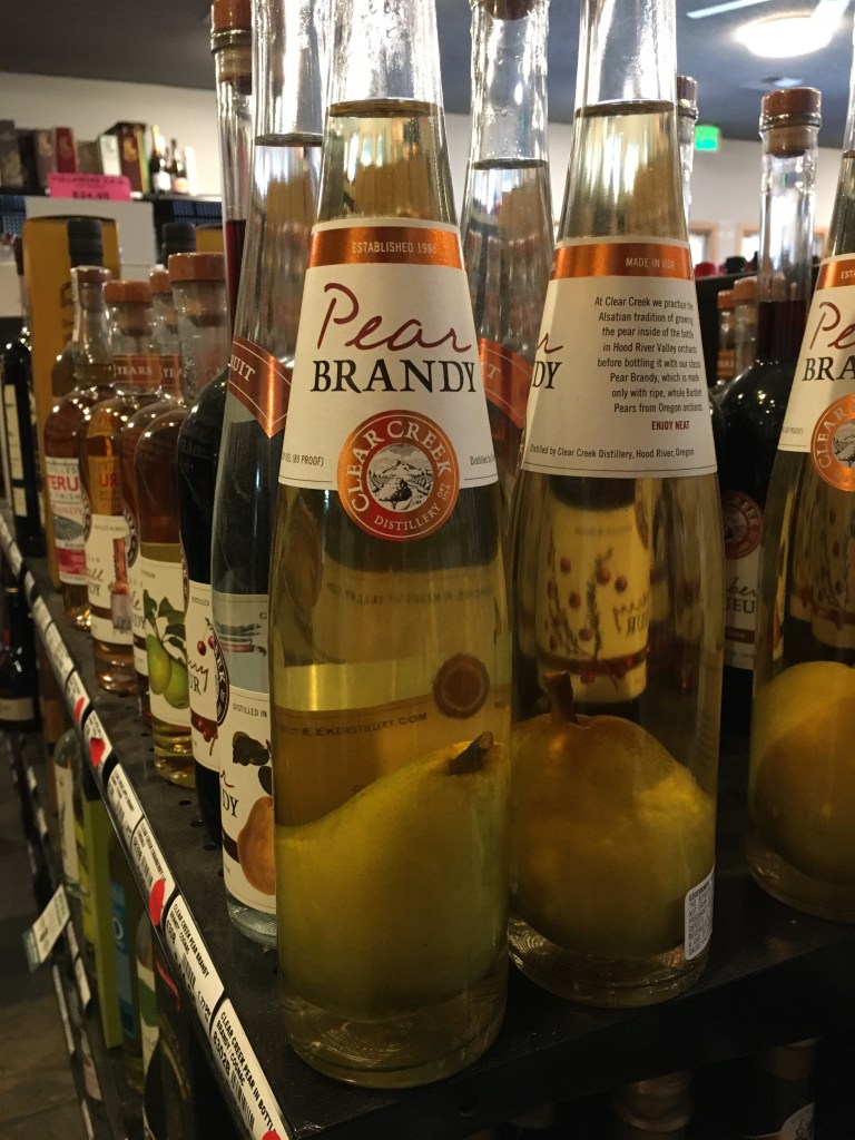 After dropping off dry cleaning and mailing packages, we stopped at Hawthorne Liquor. Auntie Bridgett is on a mission to find a certain kind of yummy cognac that we had on an Air France flight, years ago. We have yet to find it anywhere in the city. But I did have time to wonder at this improbable bottle of pear brandy!