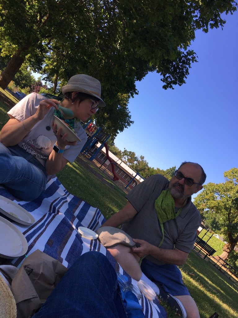 We packed up these delights and continued south to Seawellcrest Park for the “dinner out” part of our evening. We found a socially distanced piece of shade, spread the blanket, and ate up. About thirty feet away, a fellow was exercising. Further off, two young men were playing basketball. And far across the park, happy dogs met and ran and sniffed each other.