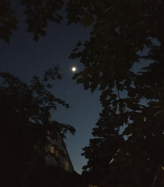 We walked home through the warm night, with the moon stepping in and out between the trees.