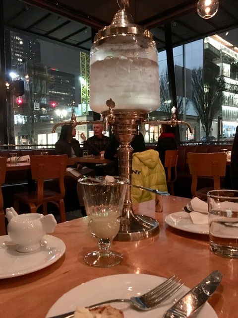 We returned the next December for another amazing evening. Moules Mariniere and a pithivier filled us up with buttery French goodness. Nelson and I enjoyed a fruity red wine, and Auntie Bridgett got a fancy absinthe set up. It was amazingly pampering. The pace was leisurely, the food delicious, and the view of downtown outside, wintry and stunning. We spent more than two hours eating, drinking, and drowning in luxury.