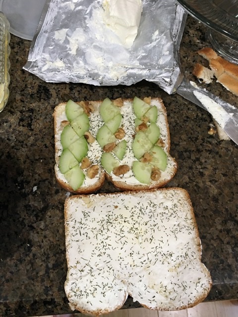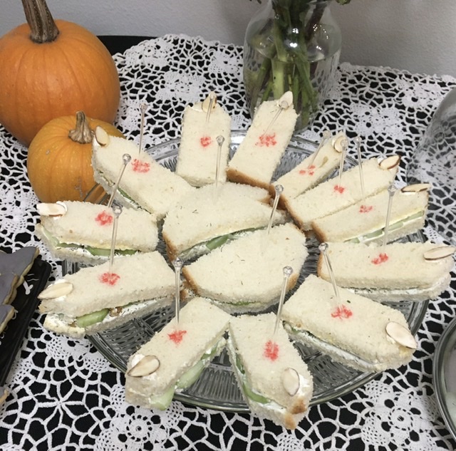 I also tried ”finger sandwiches” that were supposed to look like… fingers. They were filled with cream cheese, dill weed, and cucumber slices. The only problem is, to make them structurally sound, they need to be very fat fingers! Anyway, they were fun and tasty.