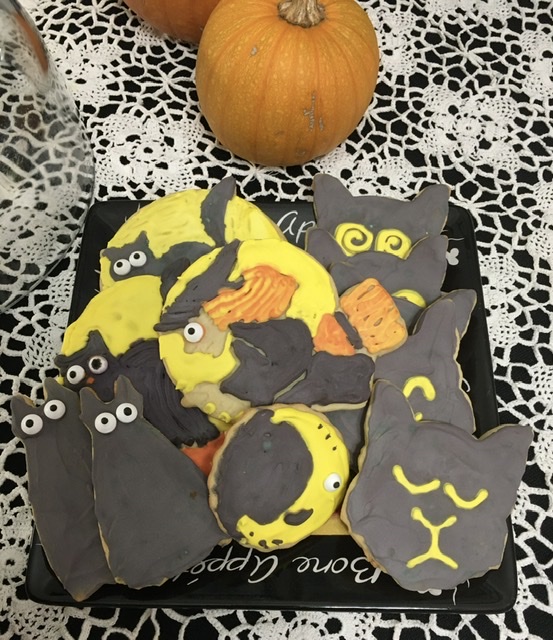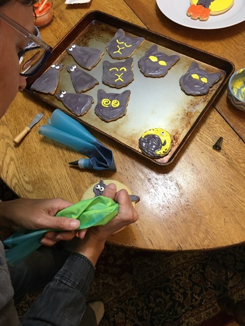 For our Halloween party, we wanted some sweets, of course. Sugar cookies, using Auntie Bridgett’s mom’s recipe, are easy to make and good to frost. I have learned how to make and use royal icing, and Grandpa Nelson gave me a nice set of decorating supplies. Auntie Bridgett’s steady hands are helpful, too.