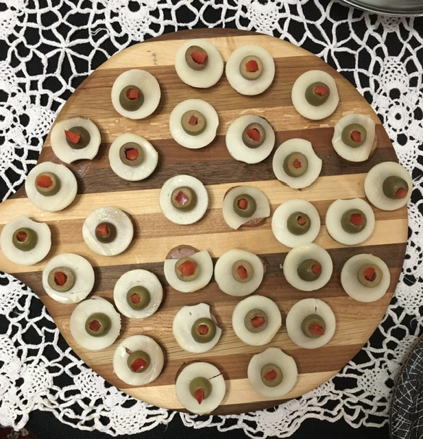 But we needed food that wasn’t sweet, as well. Our eyeballs were made from stacked slices of sausage, cheese, and olives. You eat them by stabbing them with a toothpick! Very satisfying.