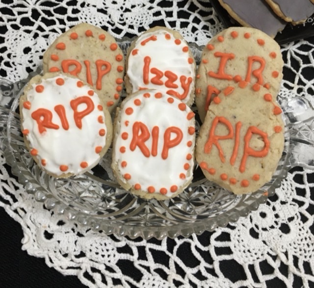 We created tombstones and vampire dentures using a walnut shortbread. It’s not too sweet, and the cookies have a nice ’stony’ look.