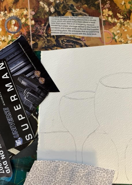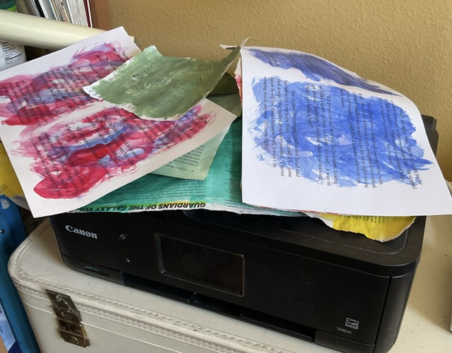 While we were in the Zoom meeting, Ruthie had us paint our sheets of newspaper whatever colors we chose. I pulled hand-me-down acrylics out of my box and slathered them on while we all chatted. I laid them aside, making sure they were mostly dry before they got piled up.