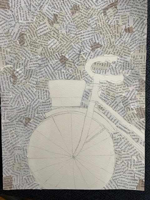 Ruthie sent us a guide for the next part of the project, a mosaic art piece of a bicycle and a basket, and I trimmed and traced it into a piece of heavy watercolor paper for the mosaic to come, editing it as I went.