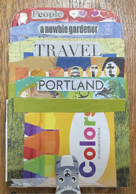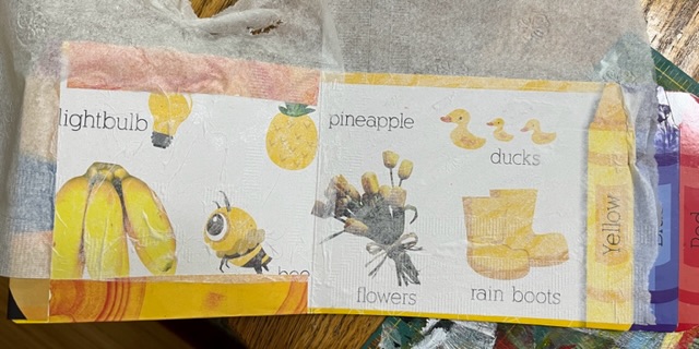 For the base of the book, I used a board book, like children use when they are little. It gives a nice sturdy work surface for collage. This one had this nifty format of short pages that get longer towards the back of the book, which made it even more interesting.