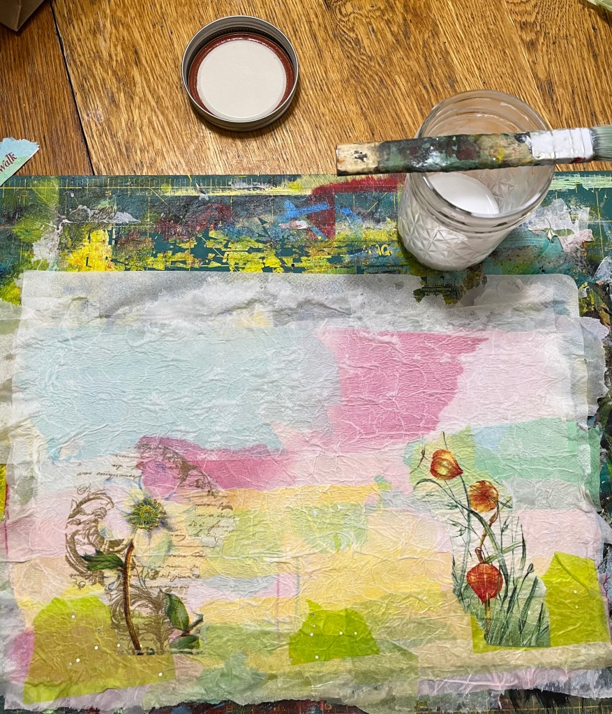 For our Zoom Art group this week, she asked us to pull together some muslin fabric, tissue papers or napkins, and some watered down glue.