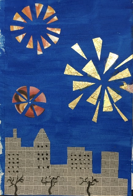 Realizing that, I got more confident. I also came to understand that different media work in different ways. Watercolors always show through, so planning is crucial. Acrylics are more forgiving and will cover up mistakes. Collage needs a careful hand but is amazingly freeing. And all of these can be used in the same piece, if you like!