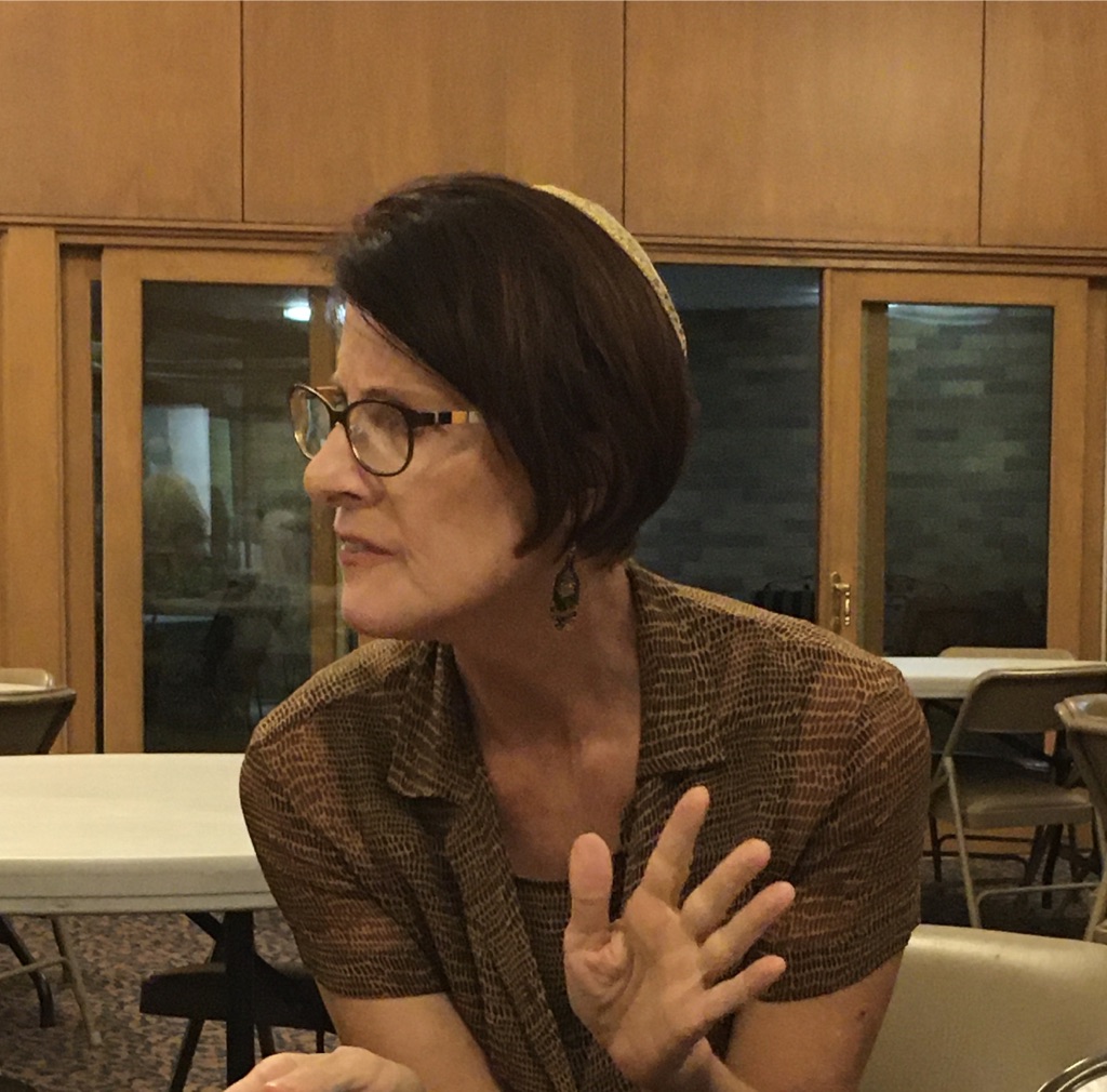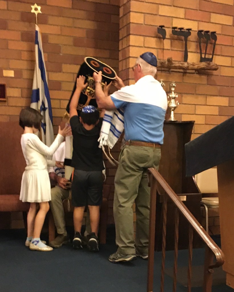 There were only about a dozen folks at services, because the community is shrinking as older folks pass away and young ones move away. The kids sat in the front row, and Cantor Margaret Bruner, seeing her unexpected young audience, included the kids in undressing and handling the Torah.