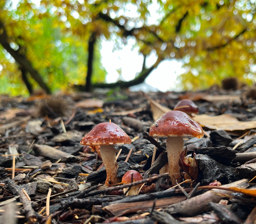 Mushrooms are popping up as the heavy drizzles encourage them, looking like fairy creatures. Getting right down in the ground is bad for my knees, but good for my pictures!
