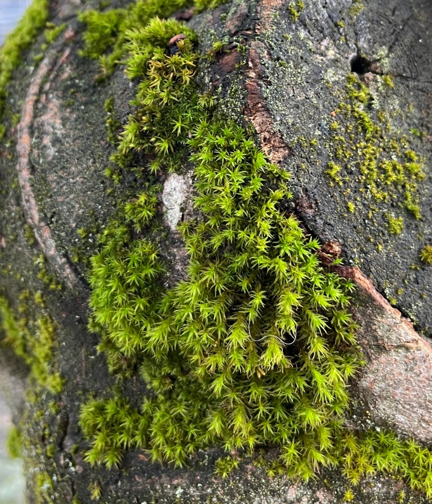 Even ordinary trees get a soft, starry green upholstery as the dormant moss wakes up in the rain.