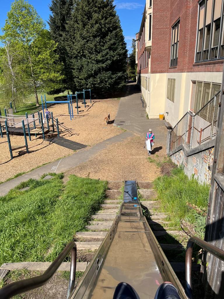 We started in the school yard, and got to see interesting details of Buckman that I’d never noticed before. For example, they have a really long slide to get down to the field.