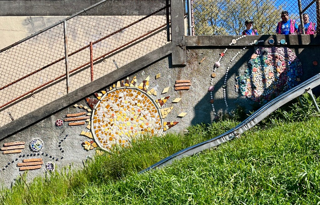 There are also delightful decorations all over the place. This wonderful mosaic is just above the slide, and can be seen from all over the field.