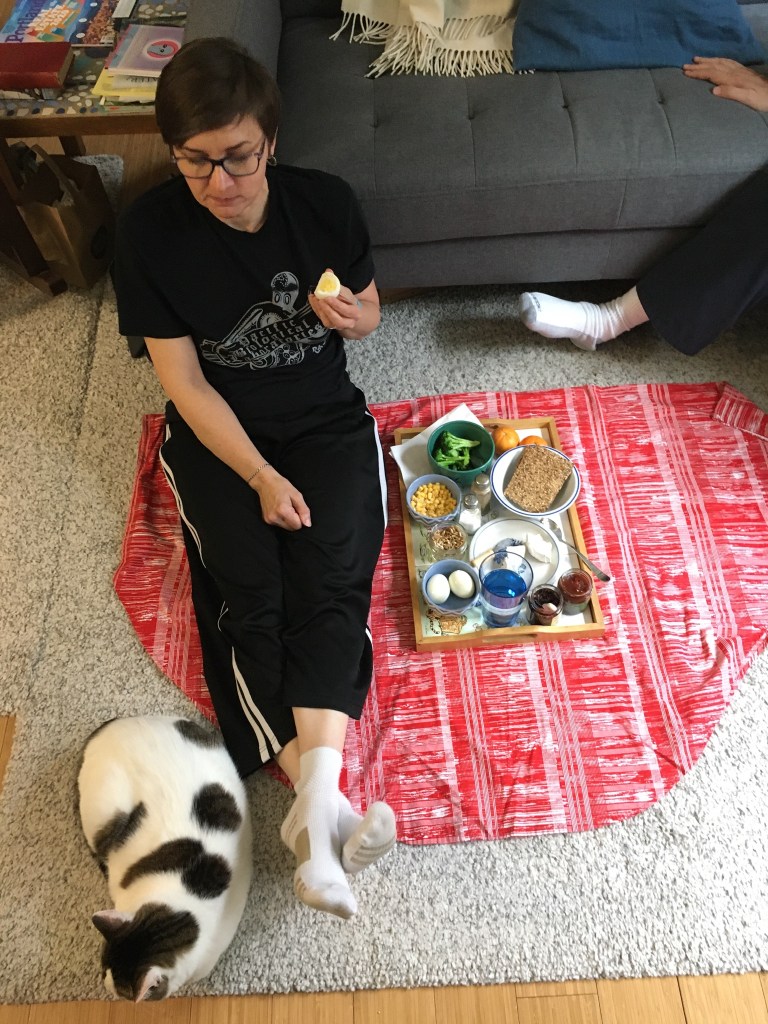 When we got home, we noticed that the dining table was covered with my mask-sewing stuff. Solution? A picnic! Auntie Bridgett and Grandpa Nelson moved the coffee table, laid out Momma’s picnic tablecloth, and put together a tray of crackers, Hard boiled eggs, goat Brie (yum), and fruits and veggies. It was a nice break from ordinary dinner, and let me start sewing the next day without having to set everything back up.